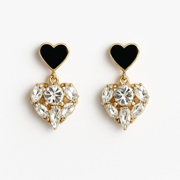 Chic, romantic, and designed to sparkle — our Black Enamel Heart Drop Earrings are a perfect expression of modern elegance. These eye-catching earrings feature a sleek black heart stud at the top, beautifully contrasted by a dazzling cluster of crystal-clear gemstones arranged in a heart shape.