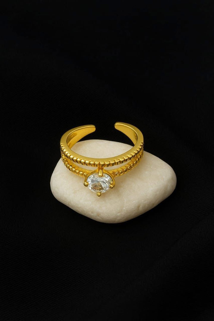 Make a timeless statement with our Gold Textured Band Solitaire Ring, a radiant blend of classic design and modern sophistication. Crafted in a rich gold-tone finish, this adjustable ring features dual beaded bands joined by a stunning round-cut solitaire crystal, perfectly center-set to shine with every movement.