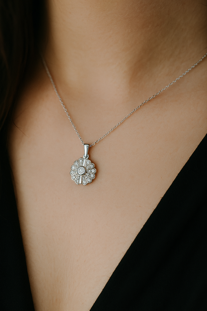 Crafted with precision, this pendant features a flower-inspired design embedded with sparkling stones that capture light from every angle.