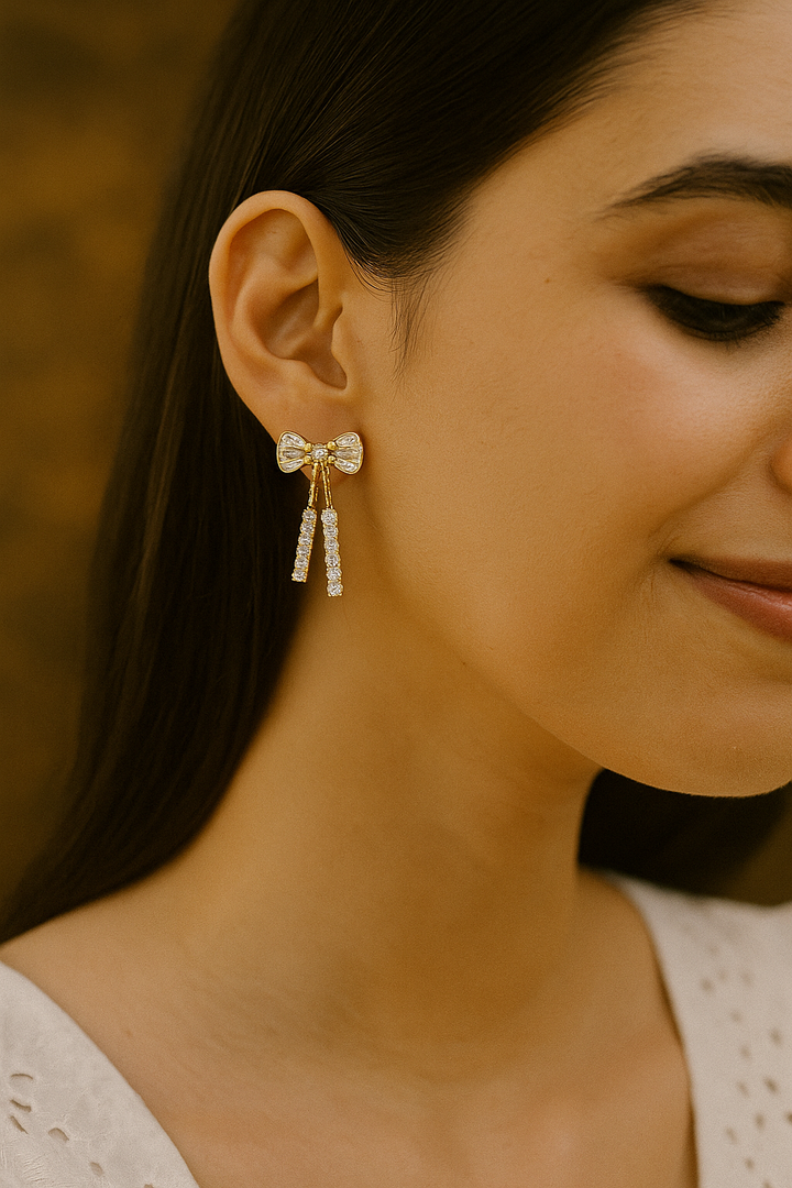 Each pair of Bow Crystal Elegance Earrings is a statement of delicate artistry — where sophistication meets subtle sparkle. The finely sculpted bow, adorned with precision-cut crystals, reflects light with every movement, creating an aura of effortless luxury.