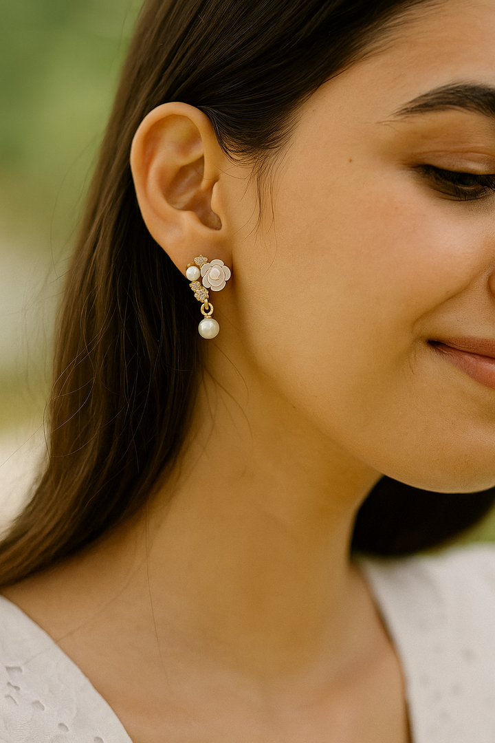 The Floral Pearl Radiance Earrings capture the essence of femininity through delicate floral detailing, lustrous pearls, and a graceful touch of shimmer. Each petal and pearl is meticulously set to reflect soft elegance and sophistication — a true symbol of classic luxury.