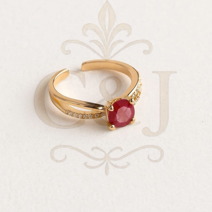 Bold, passionate, and timeless — the Ruby Radiance Ring is the epitome of modern elegance. A fiery red gemstone sits at the heart of a lustrous gold band, surrounded by delicate crystal detailing. This ring celebrates strength and beauty, making it a must-have for every jewelry lover.